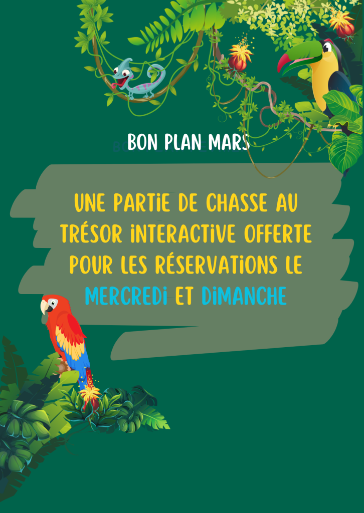 Au coeur de la jungle avec trois box différents : Jungle 1 avec Yago l’oiseau du Brésil, Jungle 2 avec notre caméléon Léon et Jungle 3 avec notre singe Filou.